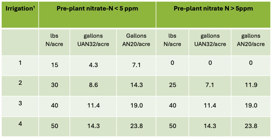 1Irrigation 1 is the irrigation of germination and stand established. Subsequent irrigations follow as needed after stand establishment. The N rates are typically by either UAN32 or AN20.